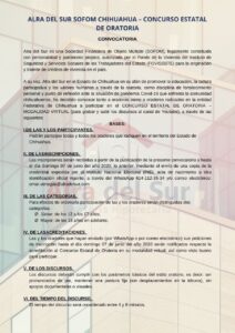 Con el propósito de fortalecer en las niñas, niños y jóvenes Chihuahuenses la habilidad para expresar oralmente, con claridad y sencillez, sus ideas y sentimientos; de fomentar el hábito por la lectura crítica y reflexiva, así como de favorecer la capacidad de valorar y utilizar la información como instrumento de aprendizaje autónomo, Alra del Sur Sofom Chihuahua convocan niñas, niños y jóvenes Chihuahuenses a participar.