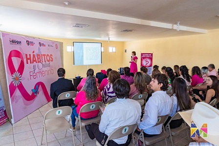 Con motivo de crear conciencia y prevenir sobre el cáncer de mama y en el marco del Mes Rosa, el Gobierno de Meoqui a través de la Instancia Municipal de Atención a la Mujer, llevó a cabo la conferencia “Hábitos y Salud Femenina” a cargo de la Dra. Adriana Farías y el Dr. Iván Rangel, especialistas en nutrición bariátrica y ginecología oncológica, respectivamente, esto ante estudiantes del COBACH, integrantes de asociaciones civiles, personal del Gobierno Municipal y Estatal, esto, gracias a la firma de convenio de trabajo signado entre la alcaldesa Miriam Soto y la Asociación Civil Luchando por Vivir y Servir.