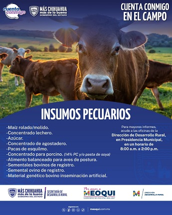 El Gobierno Municipal de Meoqui, a través de la Dirección de Desarrollo Rural, informó que se encuentra abierta la convocatoria del programa “Cuenta Conmigo en el Campo”, impulsado por el Gobierno del Estado, mediante el cual los productores pueden acceder a diversos insumos agrícolas y ganaderos.
