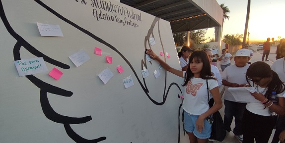 Ojinaga,Chih.- «Que la paz sea una realidad y no un deseo», fue el mensaje que escribió una alumna de la secundaria federal la tarde de este martes 21 de Octubre, mientras dicho plantel educativo llevaba a cabo una caminata «por la paz», la cual tuvo un excelente resultado dentro de la comunidad escolar y ante la sociedad ojinaguense.